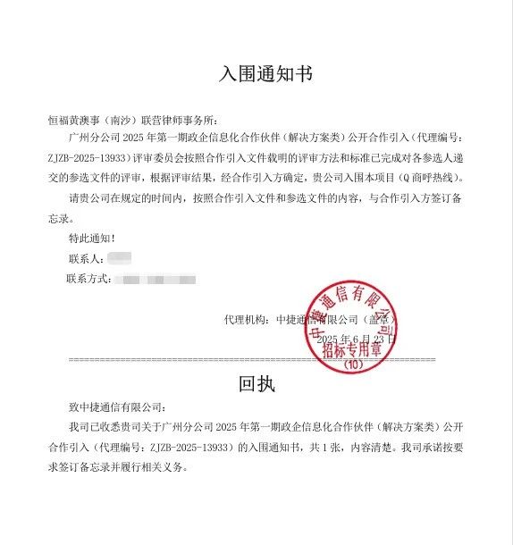 热烈祝贺恒福黄澳事(南沙)联营律师事务所凭借卓越的专业能力和优质的服务水平,成功入围了中国电信股份有限公司广州分公司(以下简称“广州电信”)2025年第一期政企信息化合作伙伴(解决方案类)公开合作引入项目,成为Q商呼热线类别的合作伙伴!这是对恒福黄澳事(南沙)联营律师事务所综合实力的高度认可,也是我们在信息化服务领域迈出的重要一步。